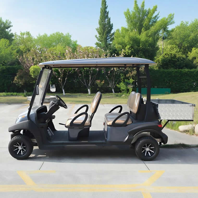 Explore our eco-friendly 4-seater electric golf cart featuring a spacious cargo box, designed for golf courses, resorts, and utility transport—this dual-purpose electric vehicle combines passenger comfort with heavy-duty storage capacity for zero-emission efficiency.